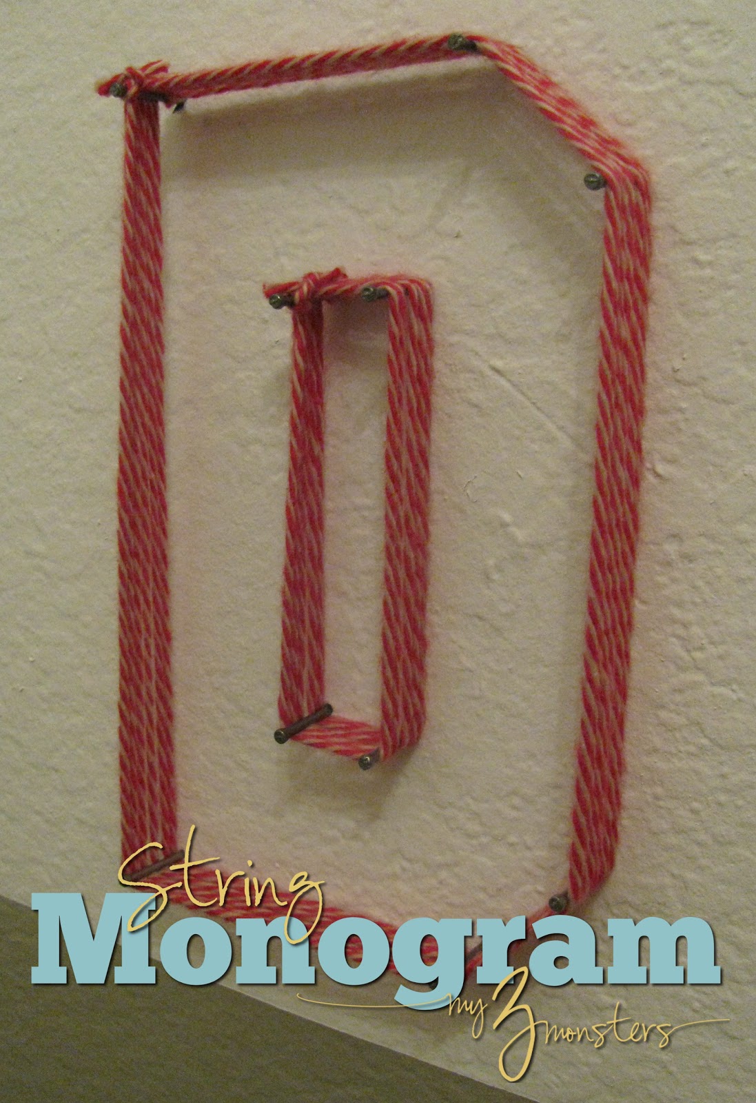 JK JK has a great tutorial, but I think it's pretty self-explanatory. I used a font called Varsity to make my templates and printed my letters out so they were about 6 inches tall. Tape the tempalte on your wall where you want it and hammer a nail into the wall at every corner of the letter template. While this project is simple, it is not for the faint of heart. It just about killed me to drive 30 or so nails into my freshly patched and painted wall, but it was worth it in the end. Once all your nails are in place, carefully remove the paper template. Tie your string to one of the nails, then wrap it around the outline of the letter 5 or 6 times and tie it off at the end.