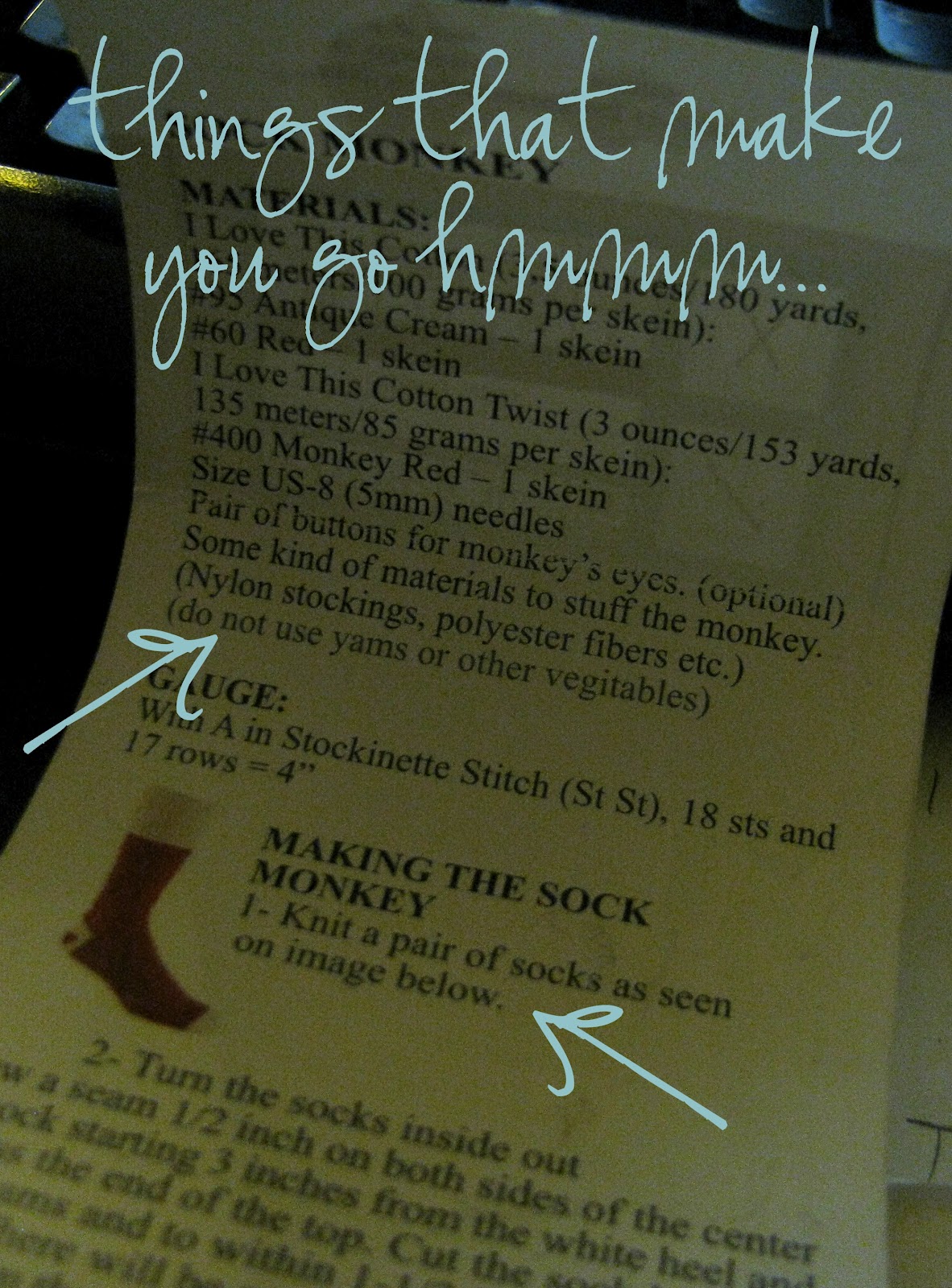 ReplyDeleteNow about the sock monkeys - cracking me up with that! What in the world? Where was that yarn made? Surely something was lost in translation...
