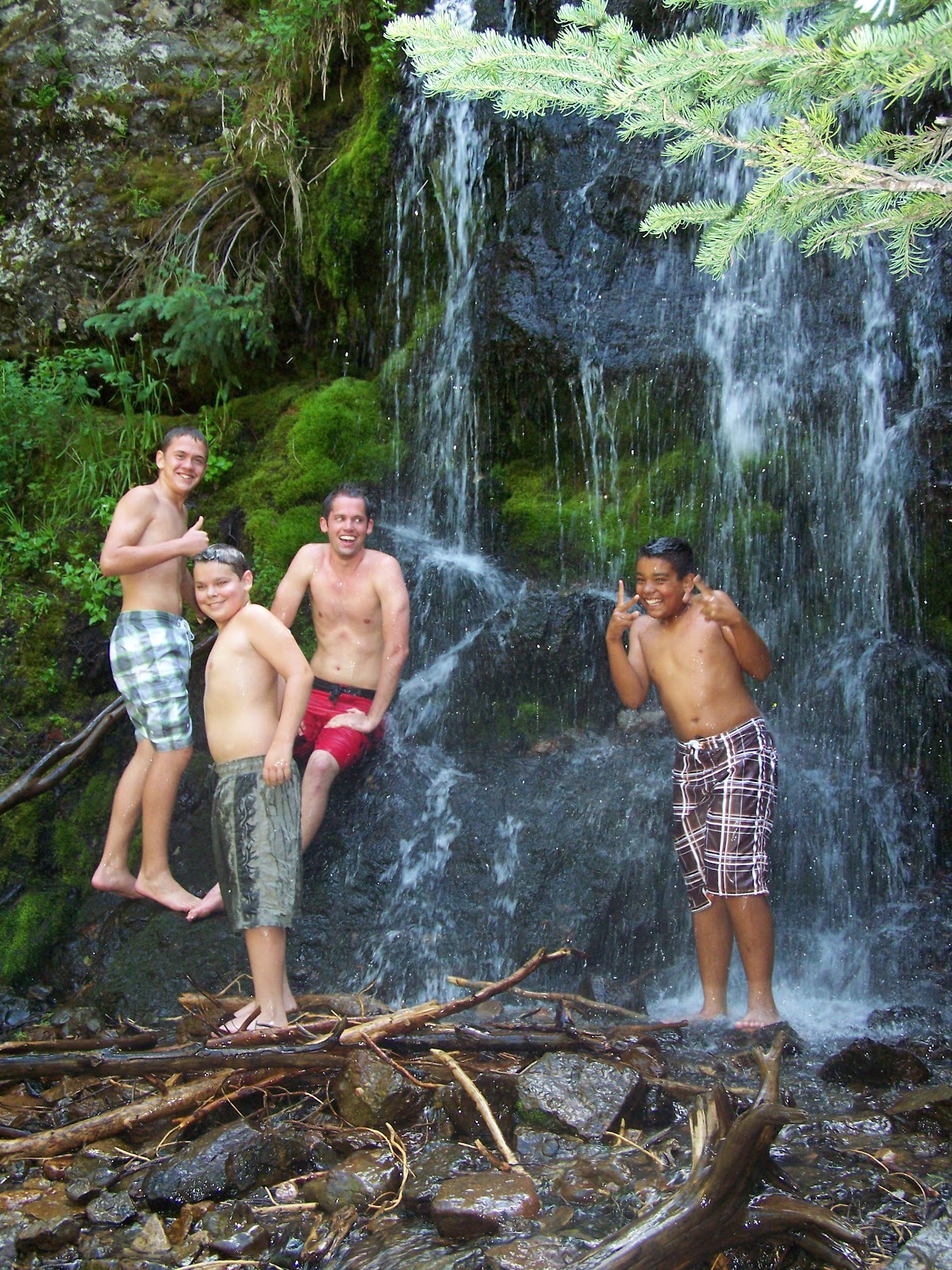 Uncle Robbie convinced his nephews to get in the melted-snow waterfall with him.