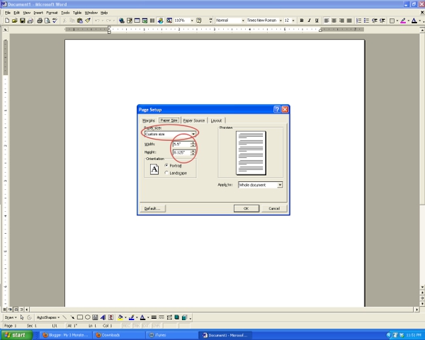 You're going to go into your word processing program and set the page dimensions to match those of your book page. Mine was 5-1/2 inches by 8-1/8 inches. In Microsoft Word, click on File and then Page Setup. In the window that opens up, I changed all the margins to .5. Then I clicked on the Paper Size tab in that box, chose Custom Size in the drop down menu, and entered my dimensions.