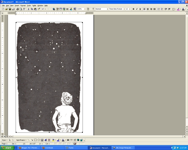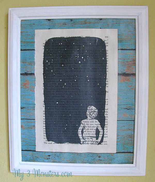 I've made some easy art by printing on the pages of old books in the past and I love the way they look. I just needed something a little more youthful {not child-ish -- oh, no} for my kids' bathroom. I found this really cool vintage image of a boy looking at the stars and doctored it up in Gimp to fit my book page.