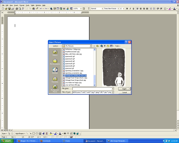 To add your picture, Click on Insert up at the top of your page. Choose Picture in the drop down menu, and then choose From File. Find the image you want to use, then click Insert.