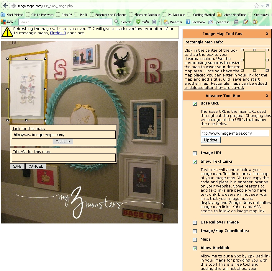See how when you hover over certain areas of the image with your cursor you get the little handy-thing that tells you you can click and go somewhere. I linked the URLs of all my previous project posts to this one image of my wall so that if you see something you like, you can easily find the tutorial. Pretty cool, huh?