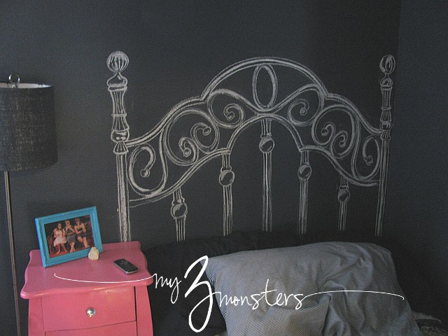 I like to draw and chalk is SUPER inexpensive, so it seemed like a natural choice for this budget-conscious room makeover. My daughter always hated her daybed before because the frame was in the way when she had to make it or change the sheets. One of her big requests for this room was a new bed. I'm not sure if this is what she had in mind originally, but she and I both love the way it turned out!