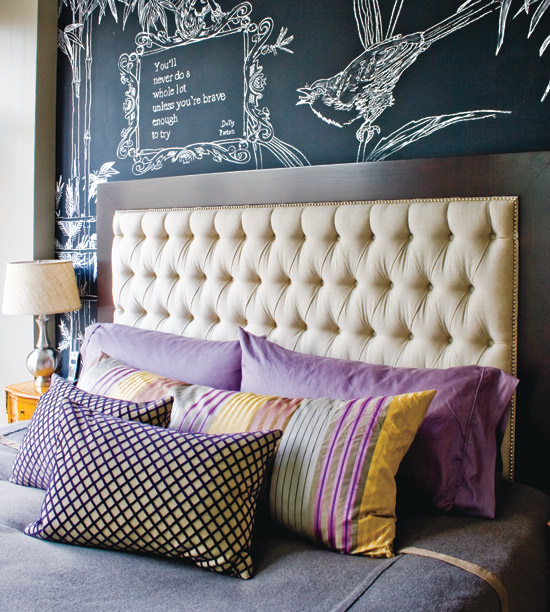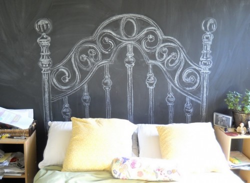 Because this is a headboard and it's going to have pillows rubbing up against it, I wanted to make sure it would stay put. You could use liquid chalk markers {also called Bistro Chalk Markers}, but they can be kind of expensive. I just used plain old chalk. If you dip the chalk in water before you draw it tends to give you a more solid line that sticks to the wall better, but even that can rub off. To help set the design, I sprayed the whole thing with hairspray when I was finished. Yep, hairspray. Just buy a can of cheapo Aquanet or something and spray it really, really well. I worried that it would leave some kind of film on the wall that would make it obvious I had sprayed something there, but it didn't. Once the hairspray was dry you couldn't tell it was there at all. When you are ready to change your design, you can wash off the old one with some warm soapy water.