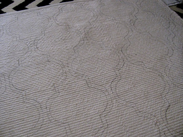 I decided to use the same design that I used on my mirrored closet doors to paint my rug, with a little variation. I printed out the pattern and cut it out of cardboard so that I would have a sturdy pattern to trace onto my rug. To begin, I found the center of my rug and marked it with painter's tape. Starting in the center will ensure that your overall pattern is centered on your rug and doesn't end up looking weird. I lined the center of my pattern piece up with the center of my rug and traced it with a pencil right onto the rug. Continue tracing the pattern onto your rug, leaving about 1/2 inch between your shapes. It will be obvious when you begin tracing how the pattern fits together.