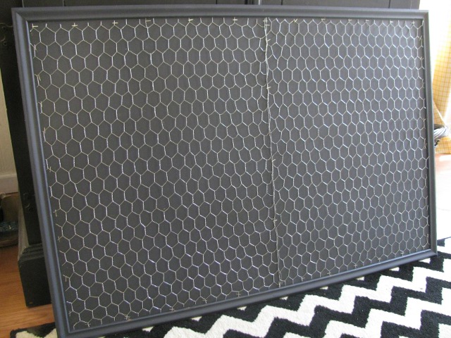 I was a little wary about working with chicken wire, but it was easy. I laid the chicken wire across my frame and stapled it down on the top edge with a staple gun. Then I used basic wire cutters to trim it to size and stapled down the other edges. My board was wider than my chicken wire {yes, even shorter side was too wide -- I tried everything, including stretching the chicken wire} so I had to make a seam down the center. That's not ideal, but it turned out alright.