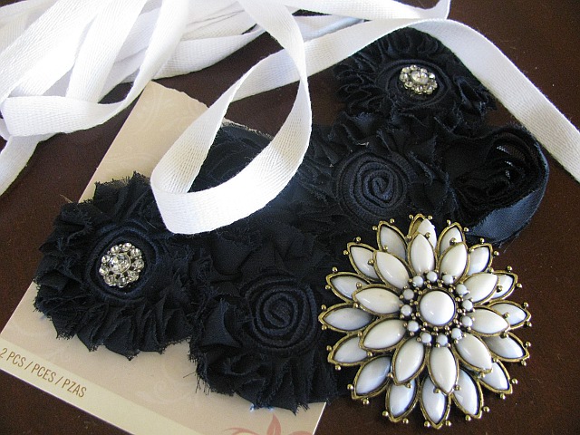 I gathered some twill tape and embellishments from my craft closet that I thought would look cute. Using hot glue I outlined the edge with the twill tape, covering the rough edges and staples. You could also cover your center seam, creating a window pane effect, but I decided to try to hide the seam with items on the board instead. Then I hot glued the floral embellishments on one of the corners. I wasn't planning on doing that originally, but Sis and I thought they made it extra pretty and feminine.