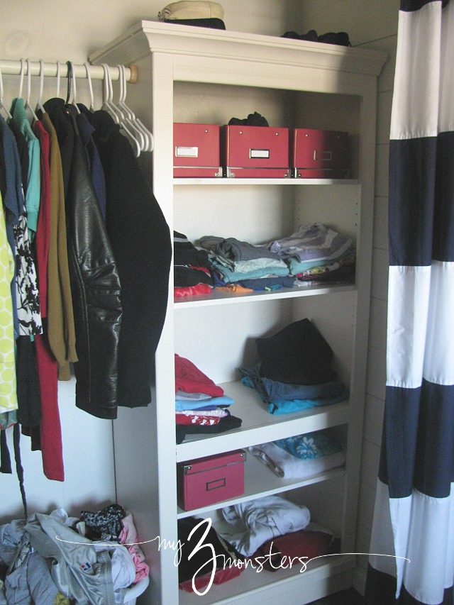 I mentioned before that my daughter's dresser was way too small and that her closet just didn't function for her like we needed it to. The wire organizer that we are currently using is just not configured well. She's a bit of a clothes horse so we really needed to find a good way to keep all her things organized and visible, otherwise she forgets what she has in there. On the floor plan I showed you on Day 2, I had placed both of her bookcases in the closet with a hanging rod in between. On paper that seemed like a good idea, but once we actually moved the bookcases in there it was ridiculous. {Remember how I told you that sometimes happens?} There was only 18 inches of hanging space between the two. While that would work for my boys who only have a couple of white dress shirts hanging in their closet, it just wasn't gonna' fly in here.