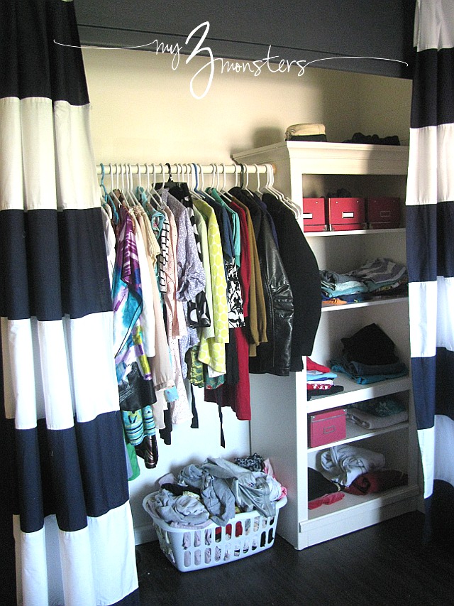 DeleteI love the curtains in place of a door. It gives you more access to everything and doors seem to darken the inside of a closet. The organization is great - and she still has room for a few more things. Plus a PLACE for dirty clothes! That is a bonus...now if only they use it :) So cute Amy!