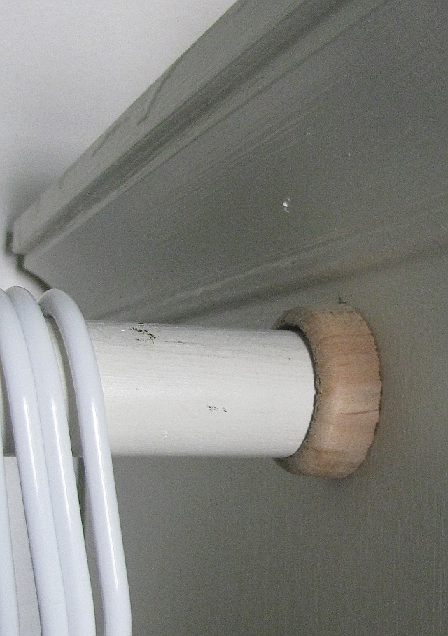 I had taken the closet rod out of another one of our closets so I had that on hand and just had to cut it to size with a hand saw. You can buy new wooden closet rods at any home improvement store. At my Lowes they are on the aisle with decorative molding and dowels. The closet rod socket sets are back there, too. We just screwed one into the side of our wood bookcase and the other into the wall of the closet. If you don't hit a stud in your wall, be sure to use an anchor bolt because the rod is going to hold a lot of weight when you load the closet up. We had to place our rod a little lower than a typical closet rod to work around the molding on our bookcase, but it works out just fine.
