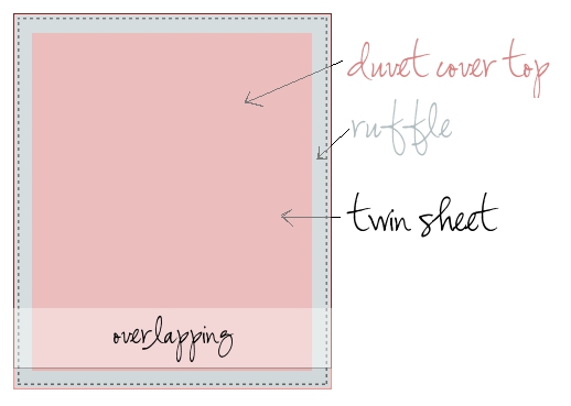 Step 5: Lay second flat sheet, right side down, on top of duvet top. The hemmed bottom edge of the sheet should overlap the piece you just pinned on and be about 2" above the bottom edge of the duvet cover.
