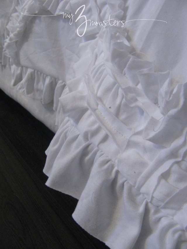 Step 3: Lay your duvet top out flat, right side up, then lay out your ruffled piece all around the perimeter. Line up the gathered edge of the ruffle, right side down, with the outer edge of the duvet top. Make sure all the arches on the duvet top are laying flat. Pin it in place and then sew it on all the way around using a basting stitch on your sewing machine. {Don't forget to return the tension to normal setting. Gathers here = bad.}