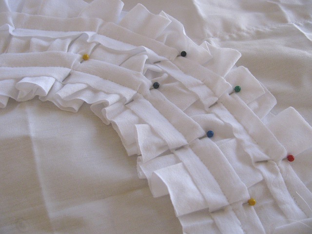 Sew around the arch, right down the middle of each narrow strip to secure it to the base fabric. The narrow strips will not lay completely flat when you sew them -- they will gather and pucker a little bit, but that adds to the ruffly look. Don't worry about it.