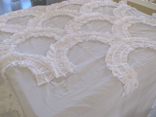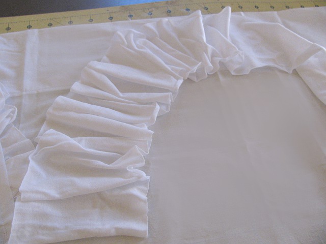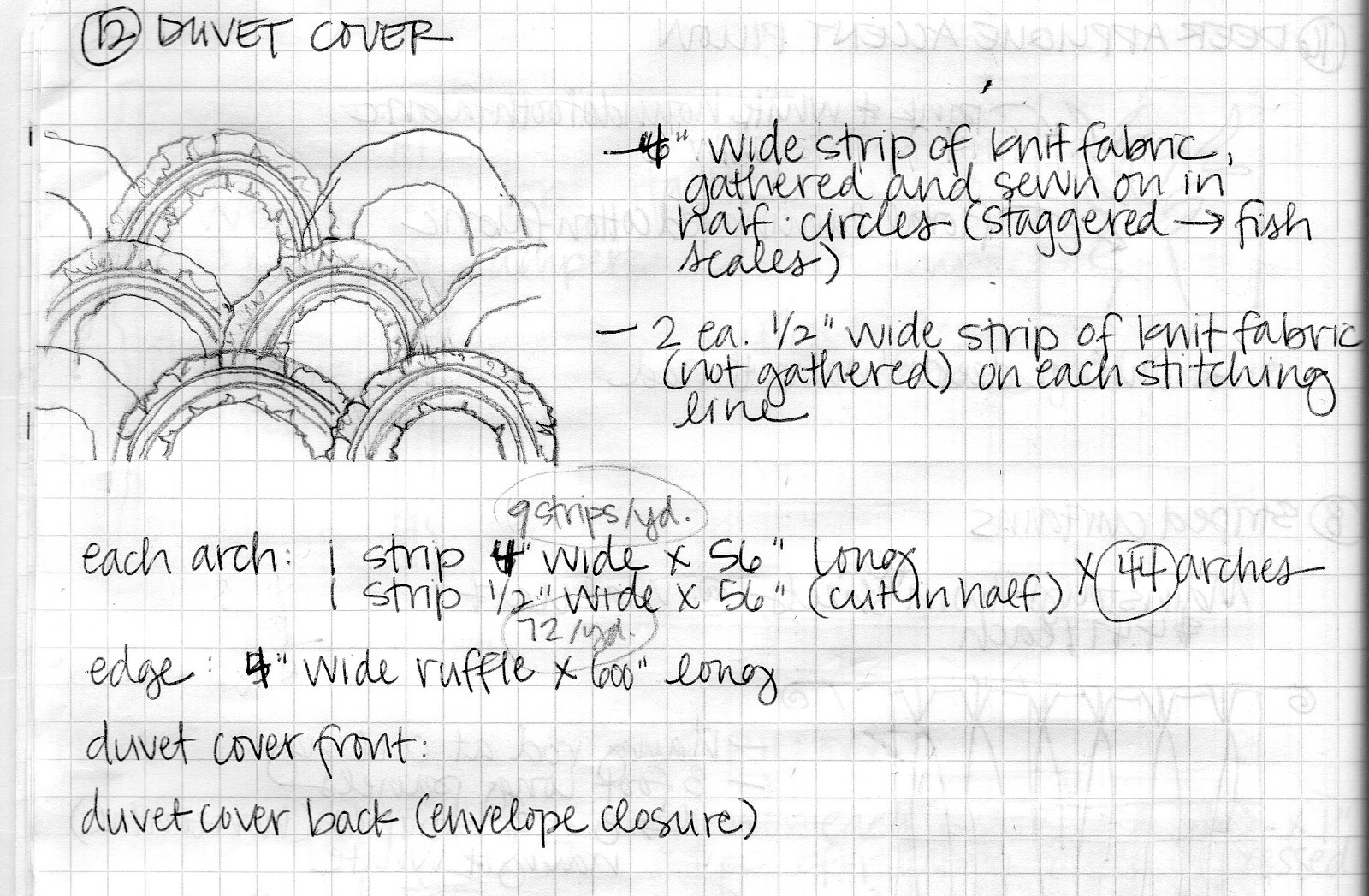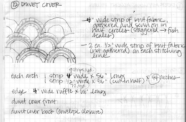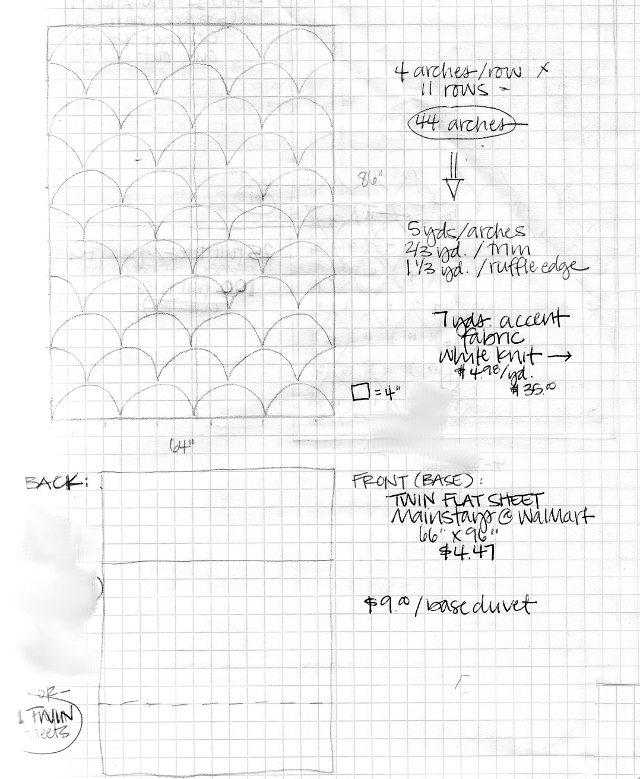 So, the plan is, basically, to sew gathered arches of jersey knit fabric onto a twin flat sheet in a fish scale pattern, then add another twin flat sheet to the back to form a duvet cover. You with me?