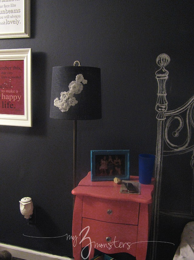 The point of this post is two-fold. First, to show you that you sometimes have to work with what you can find {or what you can afford} when working on a strict budget. And it's FINE! This is not the lamp I would have chosen for this room if I had unlimited funding, but for $5 I knew I could make it work. Plus, it has a really cool on/off foot switch on the cord. We stuck the switch to the side of the bedside table so Sis can turn it on and off without even sitting up in bed. That's pretty cool. And a burlap lampshade for $3?! Can't beat that.