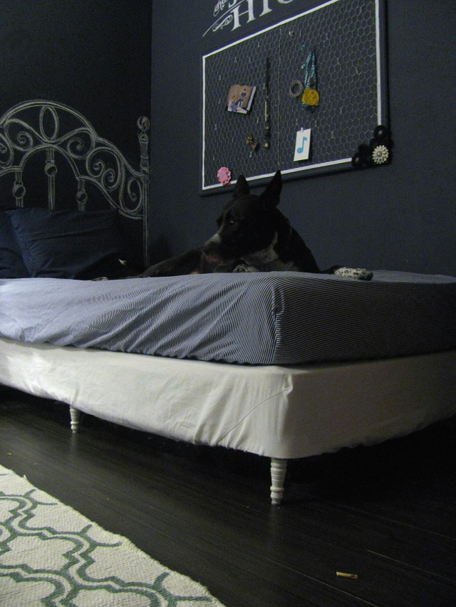 The inexpensive legs I bought made my finished bed lower than your average bed by a couple inches. You can buy taller and/or more ornate legs, but they are significantly more expensive. It's all about how much you want to spend. Sydney likes having her bed a little low because it's out of the ordinary. Teenagers are weird like that, right? Make their beds really low or really high and they LOVE it. Whatever. It works to my advantage here. For less than $20 we made a completely new bed. What do you think? Our dog LOVES it.