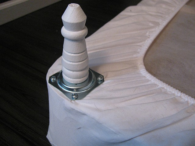 I found my furniture legs and mounting plates at Lowes for about $1.50 each. You'll need six of each -- one for each corner and one for the center of each long side. With your box spring covered, flip it upside down and screw your mounting plates into the wood frame.