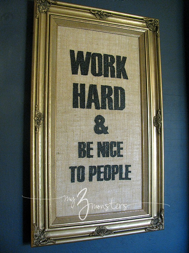 I don't know why it makes me swoon like it does. That old, chippy, ornate gold frame? The graphic look of the word art? The simple, but important message? Yes, all. Believe it or not, this was THE FIRST thing I knew I wanted to put in this room. Everything else fell into place around it. You can purchase Anthony Burill's prints all over the internet {here, for instance}, but I wanted mine to have a little extra texture by incorporating burlap so I decided to make my own knock off.