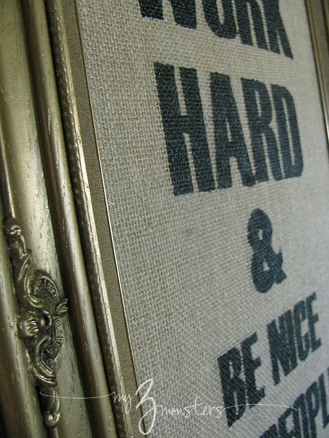 To make the word art, I simply typed up my quote in a bold, simple font {Impact, I think} in Word and printed it out. Then, using freezer paper, I stenciled the quote onto a piece of burlap. {You'll find a great freezer paper stencil tutorial here if you're not familiar with the process.} Once the paint was dry, I cut a piece of foam board to fit my frame. Being very careful to keep the design straight and centered, I wrapped the burlap piece around the foam board and stuck the edges on the back with duct tape to hold it all in place. Then all that's left to do is pop it in your frame and marvel at the beauty you just created.