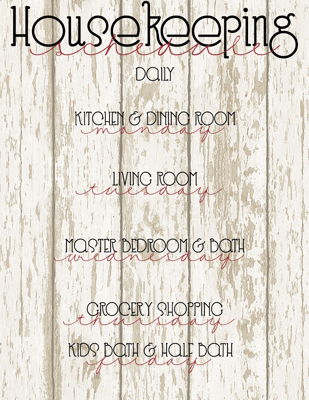 But I still believe in the system. This plan really worked for me when I was working it. Recently I decided to revisit {and slightly revise} my housekeeping plan for a new year. I got so tired of always "putting out fires" around my house -- quickly making my house appear to be clean from a distance -- and never getting on top of things and actually having a clean house. I was fed up with having my master bedroom be the dumping ground for all the crap that we frantically shoveled out of the main living areas as people walked up to our front door.