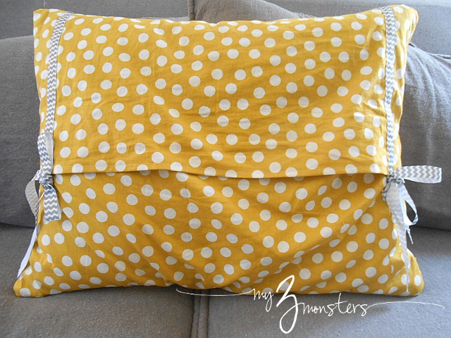 I added a little extra pizazz by sewing strips of gray chevron ribbon to the closure side and tying it closed with cute little bows. The bows are purely decorative since an envelope pillow cover really stays closed on its own. I just like bows. Whatever.