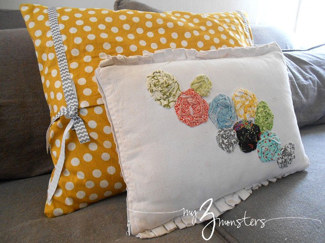 Oh, I LOVE that rosette pillow! And the new on is super cute, too....I REALLY need to dust off my sewing machine and at least attempt some simple things like pillow covers. And the book trick is so clever!