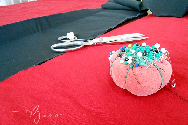 I remembered that I had some black canvas in my fabric stash so I decided to add a contrasting band to make them the right length. I could have just added the additional length at the bottom, but that would have meant picking out the existing hem and re-hemming the newly added piece. No thanks. I have Ghost Hunters to watch. I decided it would be easier {and way cooler} to add a band at about windowsill level.