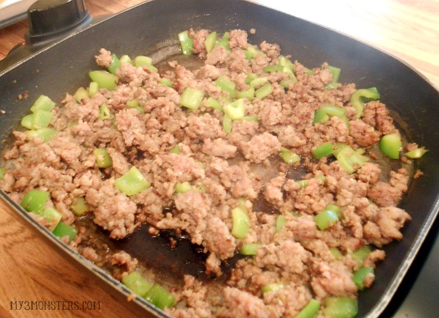 We followed the same basic recipe as the Grands! Pepperoni Pizza Bake, but we also browned up about a pound of sweet italian sausage with some diced green peppers and threw those in the baking dish, too.