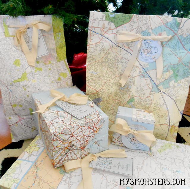 I also ordered a 100 yard roll of twill tape online for less than $10 to use for ribbon. I liked the natural look of the cotton twill tape with the maps instead of more satiny ribbon. To round out the theme, I created some printable "Joy to the World" and "Peace on Earth" gift tags.