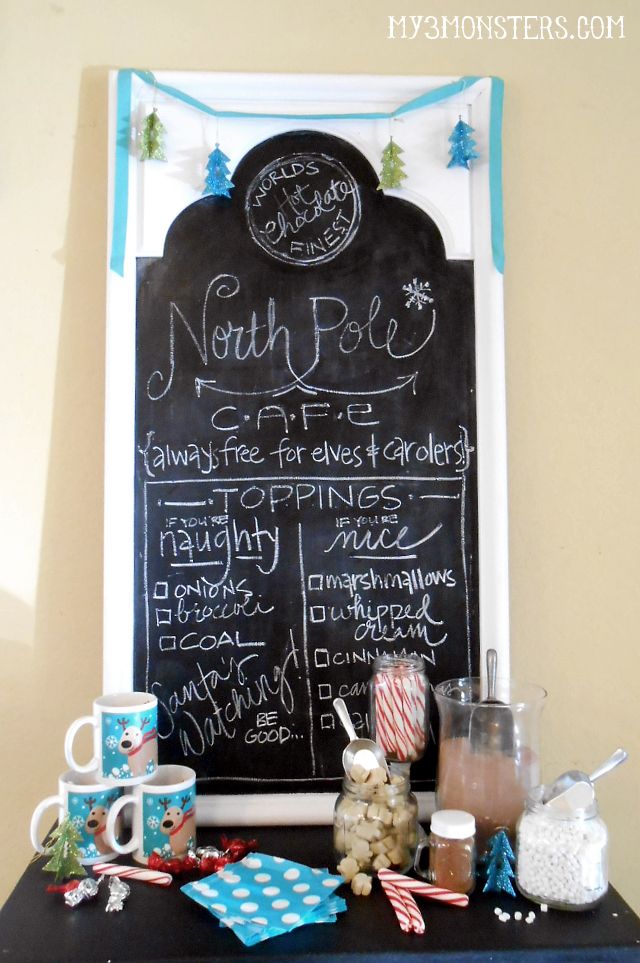 They add just the little extra oomph that this tablescape was lacking! A few of them got strung on a piece of twill tape and hung from the top of the chalkboard. The rest were nestled in and around the goodies on the table. I love the warm, cozy feeling it gives our living space -- like the whole world is welcome to come have a sip of cocoa any time, day or night.