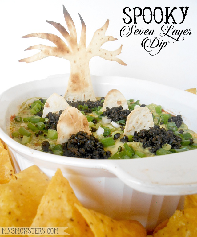 Hi, guys!! How many of you are busy getting ready for Halloween this week? We are scrambling to put finishing touches on costumes and come up with some freaky-fun food treats for Halloween get-togethers and office pot lucks this week. I took one of our family favorite dishes and gave it a "spookified" makeover for the occasion -- Spooky Seven-Layer Dip! Seven-Layer Dip is super easy to make and, with minimal effort, you can give it a fun Halloween twist.
