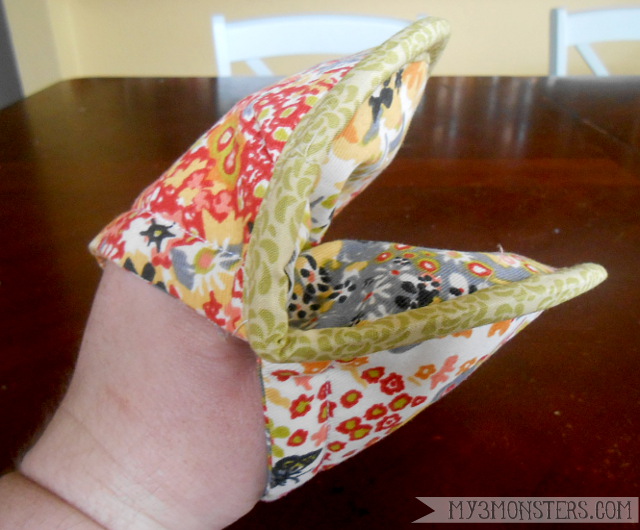 Hi guys! One thing that never ceases to amaze me is how long I am willing to live with things that I hate in my home. Some things are too expensive to tackle right now, so I have had to make peace with those for the time being. I'm talking about the little things, though, like hot pads. They are not super expensive to replace. Nor are they hard to make, and yet I have continued to use the same old, stained hot pads that I have used for the past . . . LOT of years. The ones that don't match my current decor {not sure if they ever did match any decor, ever}, have burn marks from that time I got a little too close to the heating element, and are starting to unravel in one corner. Sure, we've had a lot of dinner making, treat baking adventures together, those hot pads and I, but I'm not emotionally attached to them. It was time for them to hit the road! Then I found the perfect fabric the other day -- it had all the colors I want to bring into the room in a pretty floral pattern -- and it gave me the push I needed. To make new pot holders. Yes, this is my life . . .
