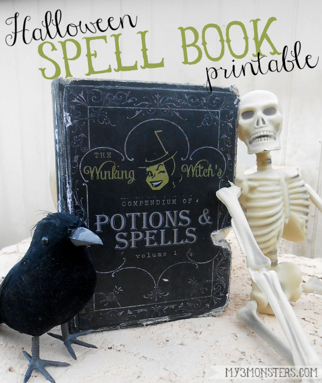 Hi guys! I am so excited to finally be pulling out my Halloween decorations. This is my favorite time of year! I was born in October so Halloween has always felt like “my” holiday. I don’t do creepy or gory, though. We’re more a vintage-y fun Halloween kinda’ family. This year I decided to make an old, worn spell book with the cutest winking witch