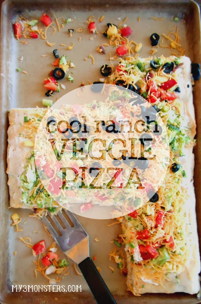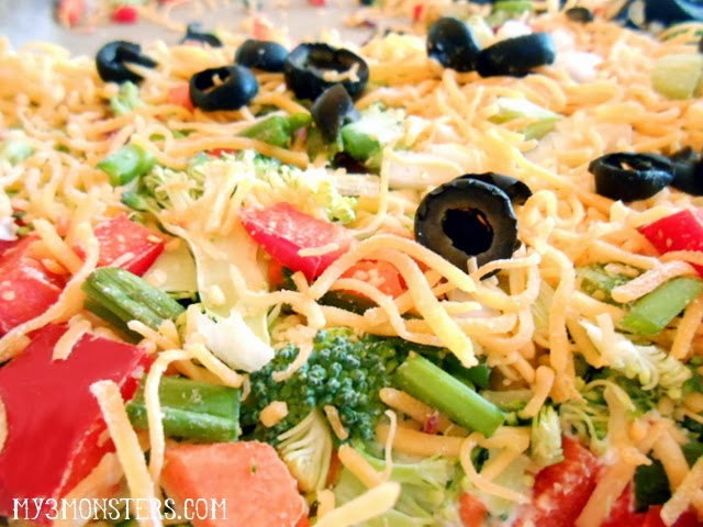 Almost everyone I know decides to try to "eat healthier" as a New Year's Resolution. If your idea of eating healthier includes eating more fresh veggies, then this recipe might be for you -- especially if you use low fat or fat free cheeses and whole wheat pizza crust. It's an awesome way to get your kids to eat a ton of veggies without a fight. Even my pickiest kid LOVES this cold veggie pizza!