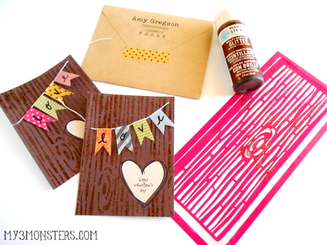 Begin by stenciling the wood grain pattern using the stencil and glitter paint. I stenciled the full pages of paper before cutting them apart into individual cards. You will have to move the stencil several times in order to cover the whole page. Since I was doing 10 sheets of Valentines, I stenciled the same area on each sheet before going back to the first sheet and lining up the stencil in a new spot. This gave the paint a little time to dry so it didn't smear in the process. Allow the paint to dry completely before cutting the Valentines out.