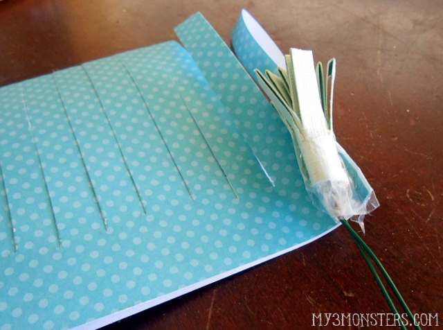 Cut a 12x12 inch sheet of scrapbook paper in half. Fold one of the pieces in half lengthwise. Cut slits all along the folded edges about ¼ inch apart, leaving about ½ inch uncut at the bottom. {Just like you did to make the center.}
