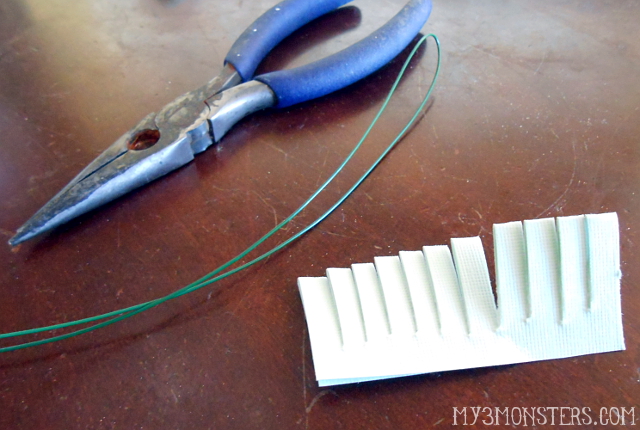 Insert the floral wire into one of the slits near the center of the piece of paper and twist the ends to hold it in place. Fold the paper in half end-to-end and roll it up around the wire as shown below: