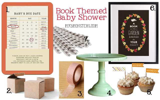 1. Baby's Due Date Baby Shower Invitations 2. 3" Kraft Favor Boxes 3. Melon Stripe Washi Tape 4. Milk Glass Cake Plate 5. Colorful Balloons Flag Stickers 6. Book Love Art Print 7. Slate Grey Paper Straws