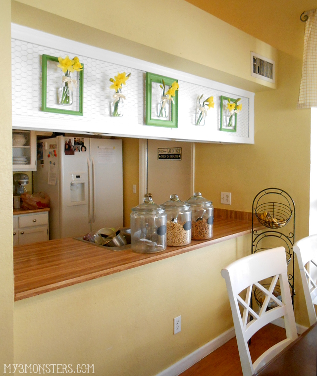 It's so pretty and cheerful you almost don't notice the dirty dishes in the sink! Hey, at least I moved them off of the countertops and into the sink for y'all. I was losing the daylight to take pictures and didn't have time to wash them in the moment. {Plus, it's the kids' chore, not mine. Just sayin'.} But the flowers are pretty -- sooo pretty, right?! Look at the floating vases, friends. Just the vases.
