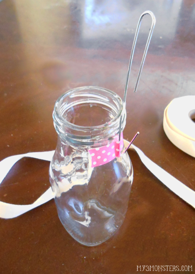 Leaving about a 6-8 inch tail, hold your ribbon on the front of the bottle {just under the lip at the top} with your thumb. Wrap the opposite end of the ribbon around the bottle twice, the first time weaving the ribbon between the two metal pieces of the paper clip, and the second time wrapping it on top of both metal pieces as shown below: