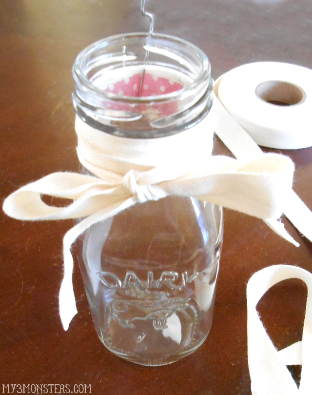 The hook is now securely attached to the ribbon {which is holding the weight of the vase when it is hanging} and the lip is keeping the ribbon from slipping off. Carefully fill each vase about 2/3 full with water and cut your flowers to fit.