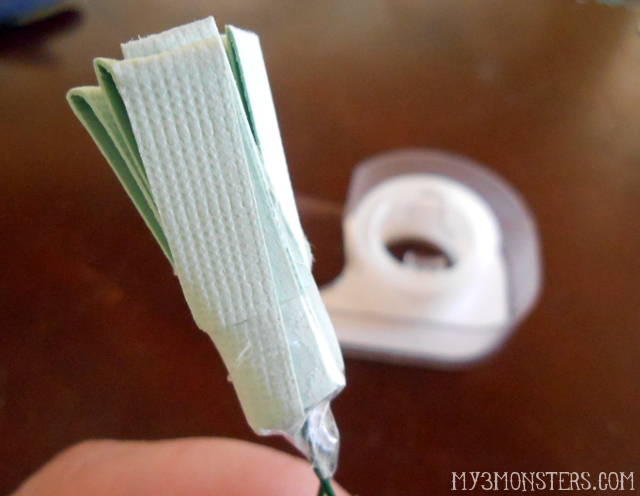 Insert the floral wire into one of the slits near the center of the piece of paper and twist the ends to hold it in place. Fold the paper in half end-to-end and roll it up around the wire as shown below: