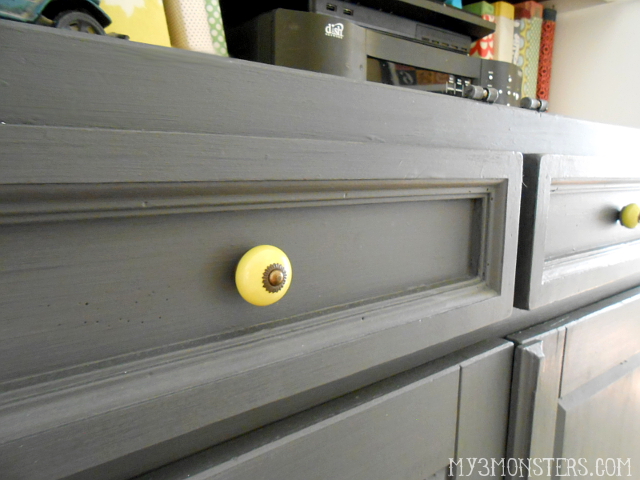This is probably the most accurate representation of the paint color that I could capture. The thing is, it looks different in all different lights so in the morning it looks lighter and grayer, but in the afternoon it is a perfect greyed-out navy blue. When I was finished painting I gave it some new knobs that I picked up for just a few dollars at Hobby Lobby. The little yellow/green ceramic knobs above were perfect for the drawers and they coordinate with the more decorative knobs on the lower doors.