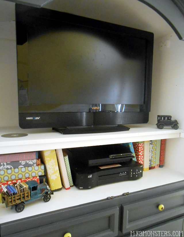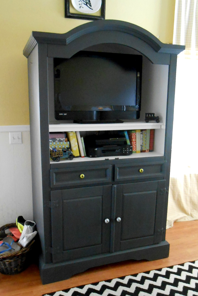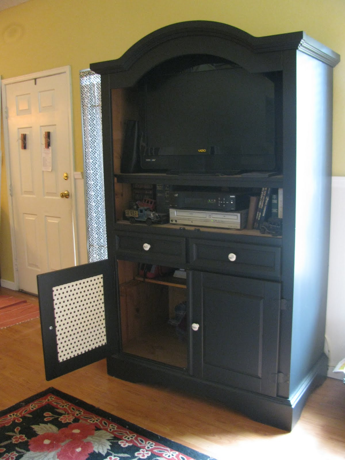 Once I was good and sure the rooster trend was dead -- seriously, I clung to it long after most folks had moved on -- I got wise and gave the armoire another makeover. I removed the pesky upper doors since we never closed them anyway, and painted the whole thing black. And I loved the armoire again for several more years: