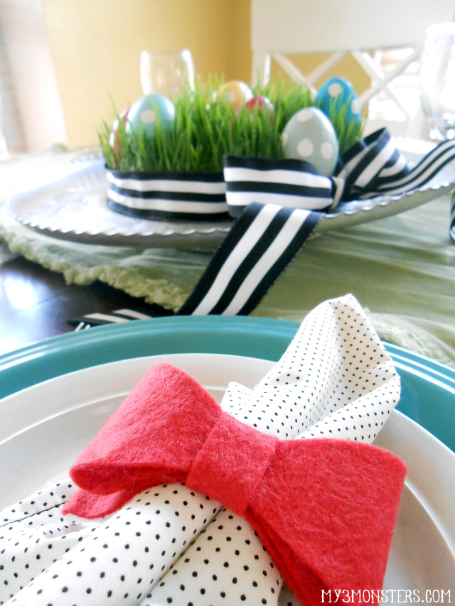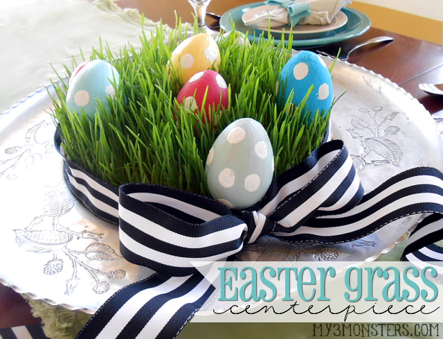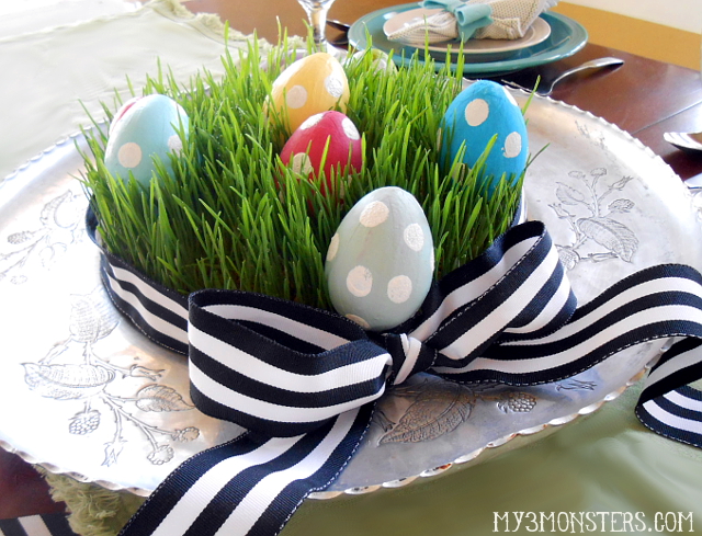 To make my centerpiece, I tied a piece of grosgrain ribbon around the base of the grass to hide the little bit of roots that were showing. I painted a few paper maché Easter eggs to scatter in the grass and add some color. To continue watering the grass, drizzle water down into the roots, avoiding getting it on the eggs.