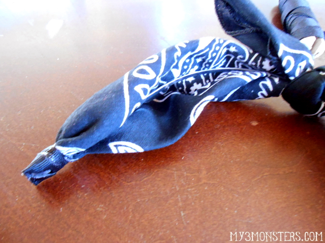 Step 4: Use a little bit of hot glue to close the fold of the bandana around the headband on each side. This just helps everything to stay in its proper place as you wear the headband.