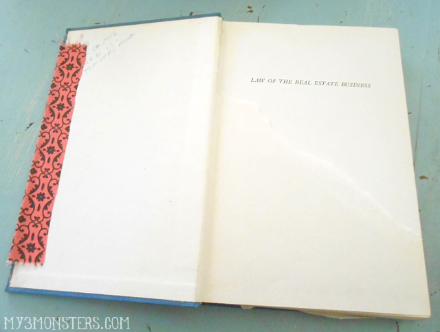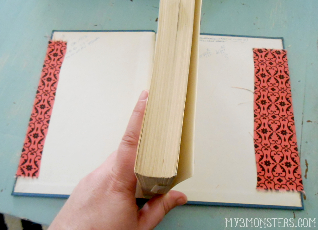 Open the front cover of the book and use a glue stick or double-sided tape to attach one end of your fabric strip just inside the front cover. Close the book and wrap the fabric around to the back. Pull fabric taut {but not too tight} and trim off the excess, leaving about an inch or two to glue inside the back cover just like you did in the front.