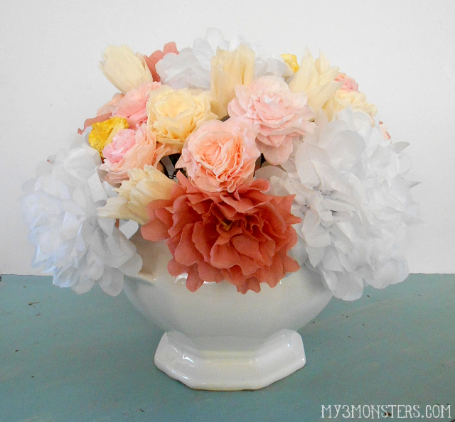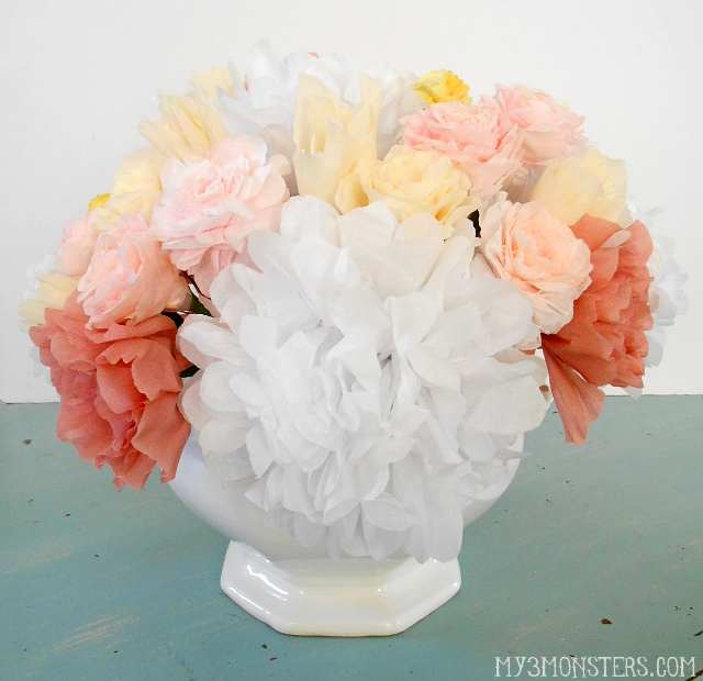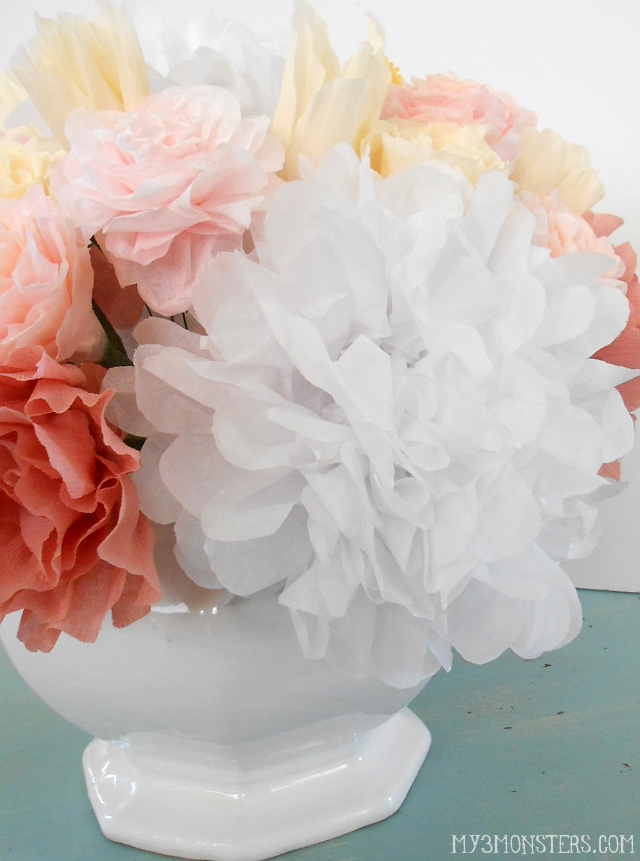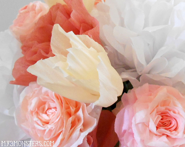Sometimes we have to get a little creative to make things work and that's just what I did. Paper flowers are super-inexpensive and they have their own special kind of beauty. Plus, they don't die so you can make them well in advance of your event. They really aren't very hard to make either. I just pulled out my crepe paper {or coffee filters or tissue paper} and scissors every evening when I sat down to watch TV and whipped a few up. Before I knew it, I had enough paper flowers for 8 table centerpieces and one large arrangement for the buffet table and I had only spent $10 {maybe $15} on supplies. Not too shabby, right?