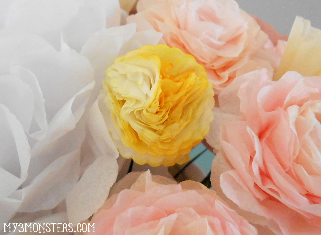 The big white hydrangeas were the easiest to make. I simply followed this tutorial on 33 Shades of Green and I love the way they turned out. I used about 1½ packs of plain white tissue paper from the dollar store to make all the hydrangeas and marigolds I needed for our event, so they're really inexpensive. Love that!